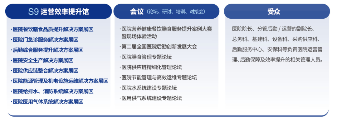 本馆将精准邀约具有决策权与影响力的关键人群,包括医院院长、分管后勤/运营的副院长,以及总务、基建、设备、采购供应、后勤服务、安保等科室负责人,确保参展商能够与目标客户进行高效、精准的深度对接。