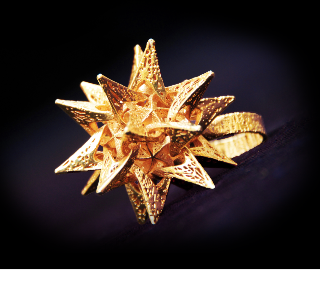 “金,是来自宇宙深处的神秘物质,带着神奇的能量推动着人类的进化。” 王开方的《K 星球》(The Galaxy-K)系列作品,从城市雕塑到珠宝首饰,演绎着宏观与微观、物质与意识、万物互联与天人合一的当代东方宇宙观。创作中通过整合多项高新科技,呈现出作品的神秘与奇妙,更是人类意志和信念的象征。