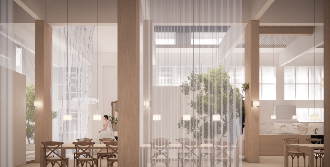 “空间不该是冰冷的骨架,要经得起生活的‘折腾’。” 赵睿提到,展厅设计刻意保留了自然生长的花草、随风飘动的纱帘,甚至允许运营时 “乱哄哄” 的烹饪场景,让烟火气融入其中。他还调侃式地将艺术品介绍牌调低,让观者低头互动,用小设计增添趣味。这种对 “不完美” 的包容,恰是他追求的松弛感 —— 空间应服务于人的感受,而非固守形式。