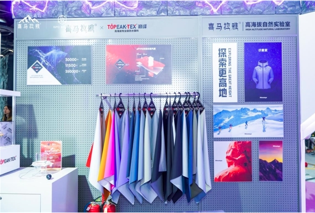 TOPEAK - TEX® 面料联合高海拔户外品牌喜马拉雅,以“共赴”为主题,提炼“高海拔雪山探险”相关元素融入展位陈列设计。在现场,TOPEAK - TEX® 面料通过的面料性能测试装置与互动实验,直观地向观众展示了面料卓越的防护性能。在展览现场,设置了一系列的面料性能测试装置,通过互动实验让参观者亲身体验防水透汽实验,直观有力地将实验成果向大众呈现。TOPEAK - TEX® 面料,采用ePTFE双组份透汽膜技术,是专为高海拔探险等户外运动打造的功能性防护面料。作为与中国纺织科学研究院江南分院联合研发的功能性防护面料,TOPEAK - TEX® 的高防水性能也已获得国家发明专利授权。本次参展与喜马拉雅合作开发多款冲锋衣,便是TOPEAK-TEX® 面料向户外领域强势出击的步。「国研面料 x 国产冲锋衣」的有机结合,也意味着国内户外装备领域将进入更值得期待的全新纪元。