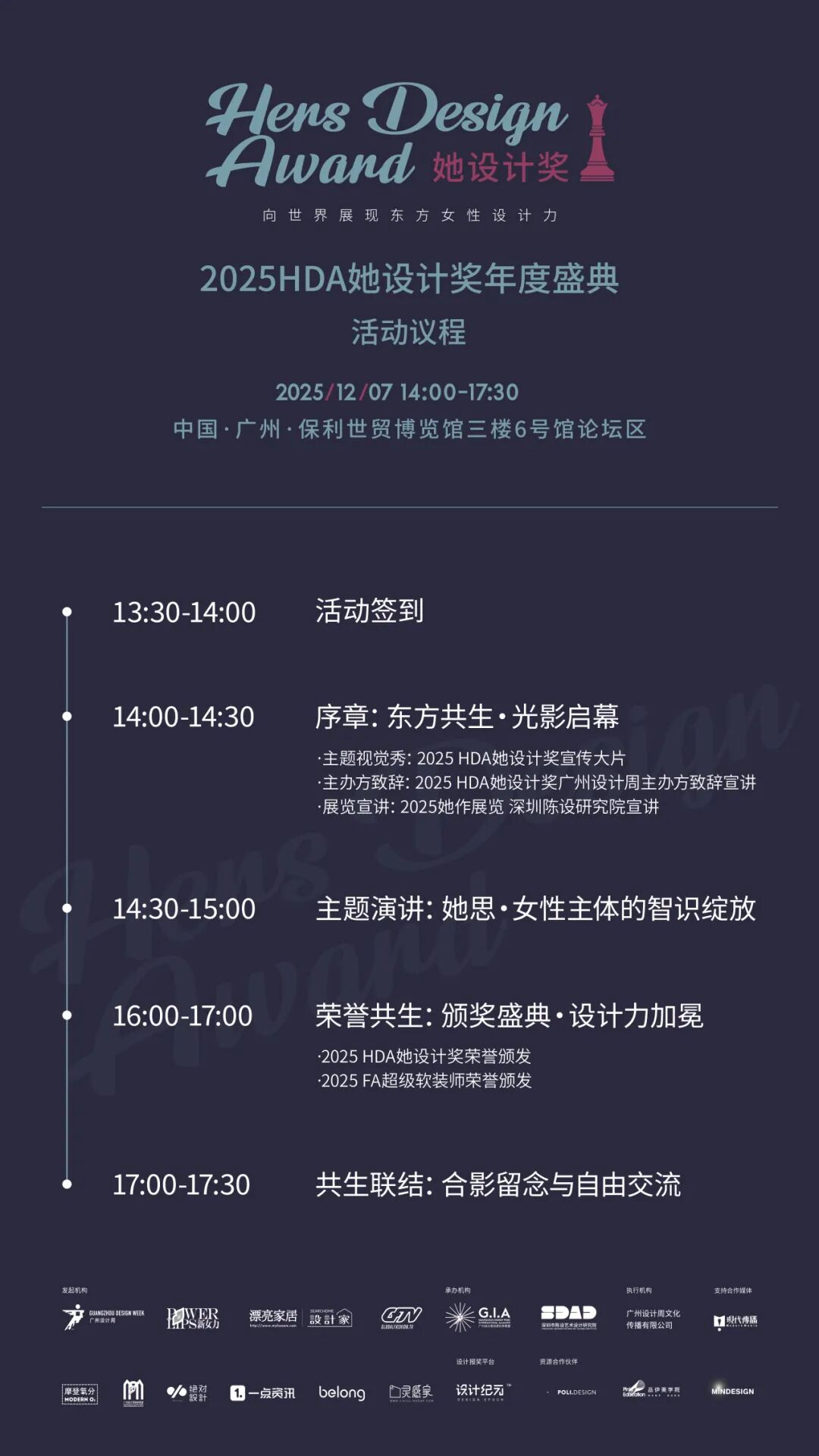 想提前了解HDA她设计盛典嘉宾的设计故事?想第一时间获取获奖作品亮点?或是《她作》展览创作者的惊喜创意?亦或是艺术设计共同体的报名细节?关注广州设计周HDA她设计,我们将持续释放嘉宾专访、奖项进展、作品预告、共同体赋能等内容,带你全方位走进这场女性设计与创作盛宴。