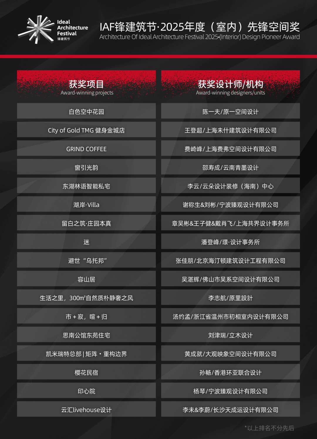 祝贺以上荣获“IAF锋建筑节·2025年度(室内)先锋空间奖”的获奖单位! IAF锋建筑节期待与更多支持者们同频共振,凭借不忘初心的坚守和砥砺前行的激情打造一份收获颇丰的年度答卷;希冀能收集更多充满创意与哲思的作品以及结识更多具有参考性的设计思考与实践脉络的建筑设计师,共同探索建筑设计的未来!