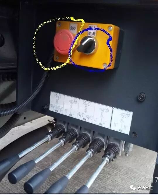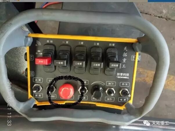 CAOZUO/ 操作流程1 将泵车行驶停放到工作区,拉好手刹将档位拨至空挡熄火;下车观察泵车所在位置是否在坚实的地面上,尽量将泵车停在泵送臂架工作范围内。2 观察好地形后,将电控箱操作面板上的行车开关转换至泵送位置,启动底盘发动机,将底盘档位挂到6档。检查各处的急停开关是否打开(该设备设计有5处急停开关,即1、搅拌机电箱;2、支腿与臂架转换位置;3、主电控箱;4、泵车无线遥控器;5、搅拌机有线遥控)如任何一处急停开关处关闭状态,操作将无任何动作,请检查上述五处急停按钮是否打开。3