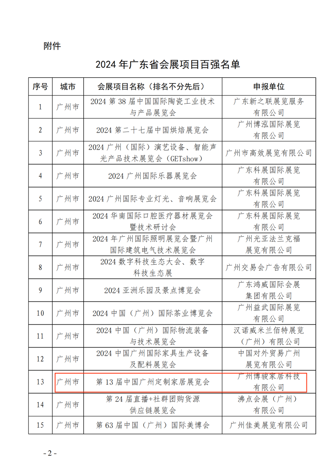 经过项目申报、初审、专家评审、复核及公示等严格程序,第13届广州定制家居展成功入选由广东省商务厅认定的2024 年广东省会展项目baiqiang名单,成为全省会展业高质量发展的biaogan项目之一。