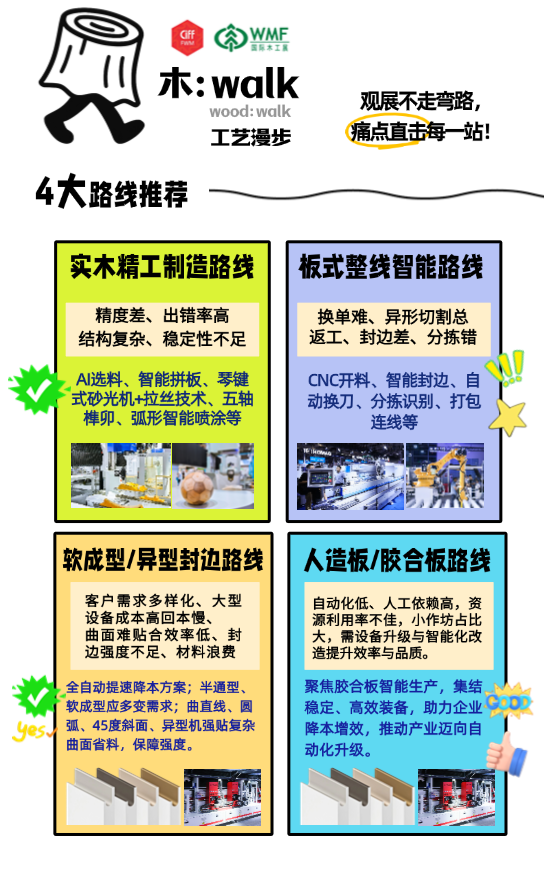 围绕当下家具制造的四大核心赛道,WMF策划出四条精选路线,聚焦产线升级、效率优化、工艺难点与新趋势观察。每条路线都配有重点展品推荐与解决方案指引,助你边看展、边找解法,边采买、边布局未来产线!