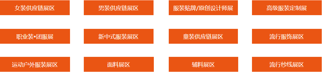 •面辅料展区:时尚女装面料、正装面料、内衣面料、功能性面料、牛仔装面料、运动装面料、辅料、皮革面料、蕾丝/刺绣、服装辅料、纺织品相关检测/服务/设计/机器等。
