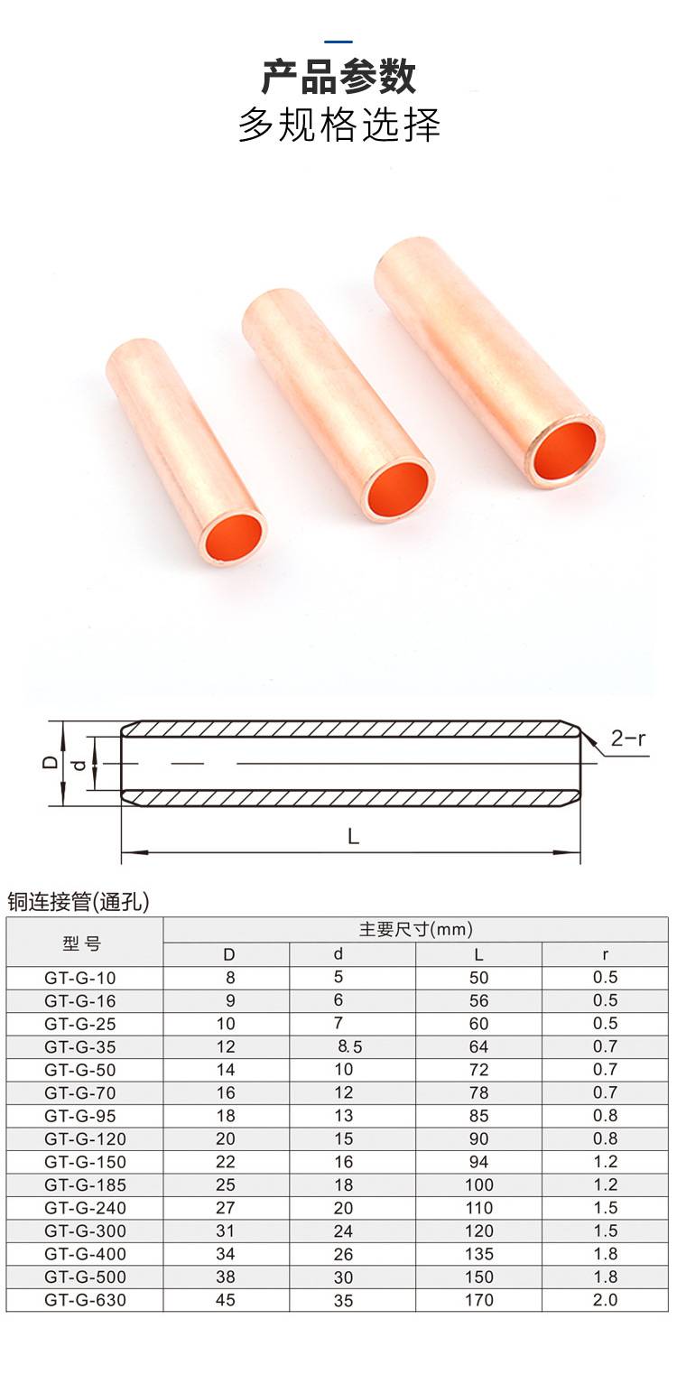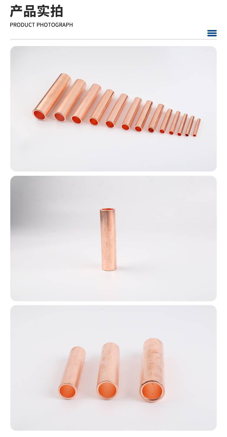 GT铜接线管中间接头是一款专为电力电缆、工业设备及家电线路设计的铜制连接件,采用高纯度紫铜材质,表面可镀锡或酸洗处理,具备优异的导电性、耐腐蚀性和机械强度。产品符合国标(如GB/T 14315-2008),适用于电缆对接、设备接线等场景,确保电流传输稳定可靠。