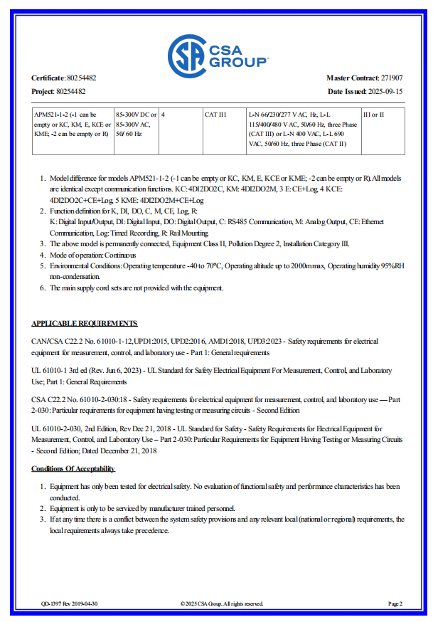APM521系列网络电力仪表凭借其高精度测量(电压、电流误差±0.2%)、灵活的安装方式(嵌入式与导轨式)以及丰富的扩展选项(DI/DO、AO模块),能够满足各种定制化需求。其通过UL、CE等国际安全认证,符合严苛的CATⅢ/CATⅡ安全标准,确保了在全球市场,尤其是北美地区的合规性与高可靠性,为工业自动化、智能楼宇、新能源(如光伏储能系统)以及海外电力项目提供了准确的监控解决方案。