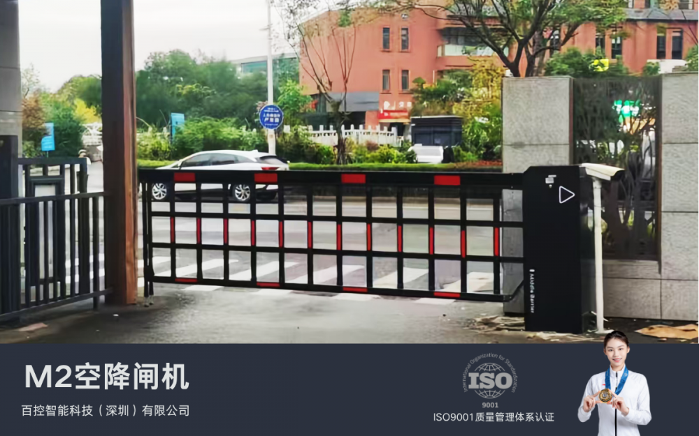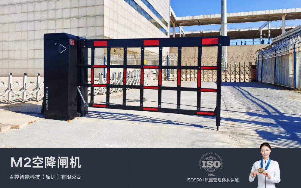 1.百控 M2 重型空降闸机专为解决普通栅栏道闸防翻越高度不足问题,采用中置安装,146×50MM 加大横梁设计,增强抗风及拉伸强度。