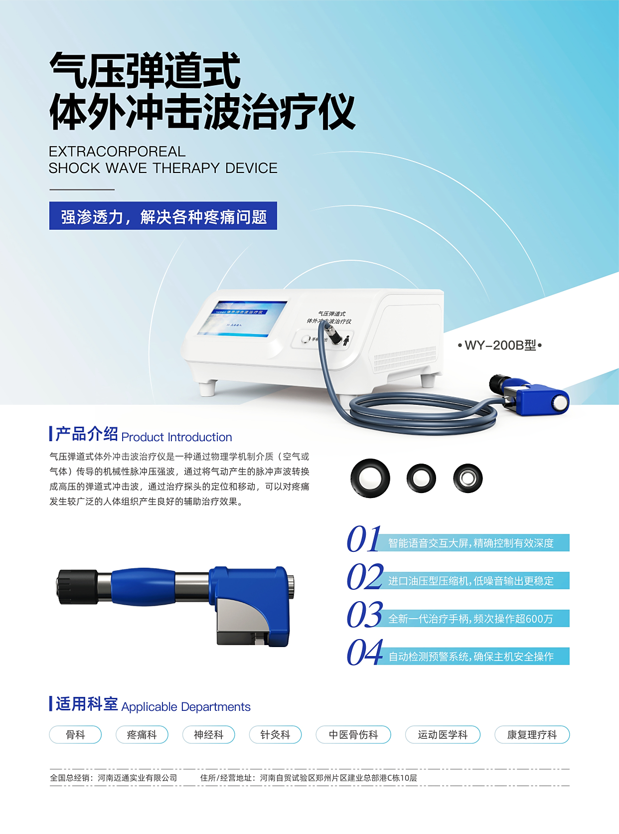 临床中的康复故事,更让这款仪器的 “战斗力” 有目共睹。65 岁的王大爷受肩周炎折磨两年,肩膀zui多抬到 60 度,连洗脸都得侧身,试过针灸、推拿都没好转,做了 2 次体外冲击波治疗后,居然能举着杯子喝水了,完成疗程后更是能轻松举高手臂浇花;28 岁的健身爱好者小陈因过度训练患上网球肘,疼得握不住哑铃,治疗 3 次后就重返健身房,如今早已恢复正常训练。现在,无论是三甲医院的康复科,还是社区的健康服务中心,都能看到这款仪器的身影,成为医生推荐的 “慢性疼痛首 选疗法”。