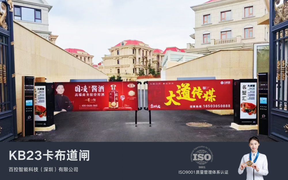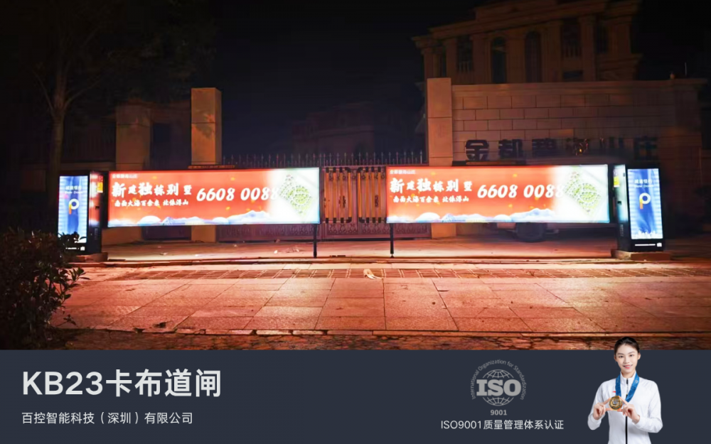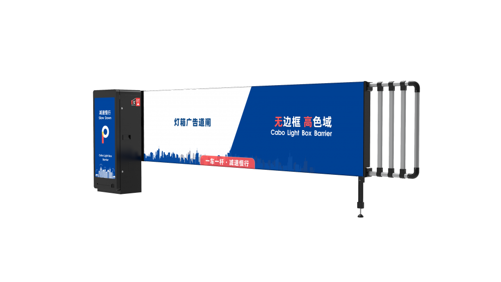 1:超强抗风,100mm 杆夹、90mm 型材配内置 L 角设计;3000×800mm 卡布画面展示佳,内置 24V 防水灯条,极端天气可拆广告,闸杆正常运行。