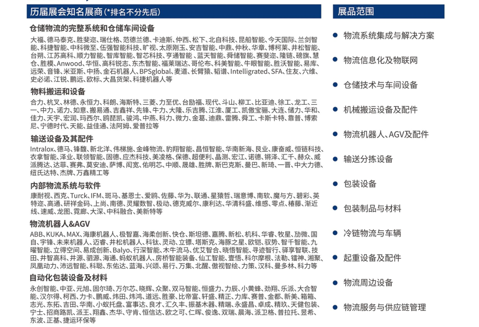 自2010年首 次举办以来,展会已成功举办16届,围绕“智能造”“智慧物流”两大主题,打造一站式物流技术与应用展示平台。随着后疫情时代,数智化转型升级“提速”,展会聚焦“智能、创新、技术”,深挖行业用户痛难点,充分满足观众个性化需求,全面联通智慧工厂生产、制造、仓储、配送、零售等上下游企业,为展商和买家搭建全产业链的交流合作一站式平台。