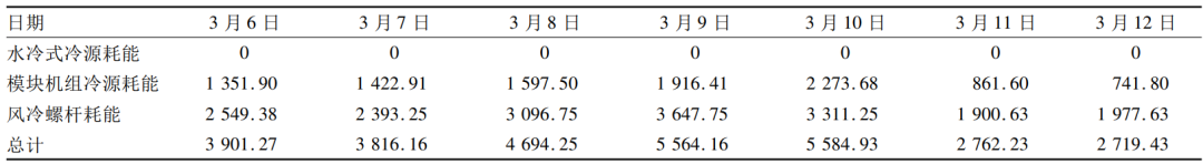 以中山大学中山眼科中心2023年11月冷源转换前后连续工作日的能耗对比分析为例。6-10日手术室冷源与大楼水冷螺杆共用,风冷螺杆待机启动,风冷模块机组停用,此时水冷主机设定出水温度为8.5℃,风冷主机设定出水温度为9℃,此时各机组耗能见表3。13-17日对手术室冷源进行转换,关闭大楼水冷机组,开启手术室专用风冷螺杆机组,耗能数据见表4。