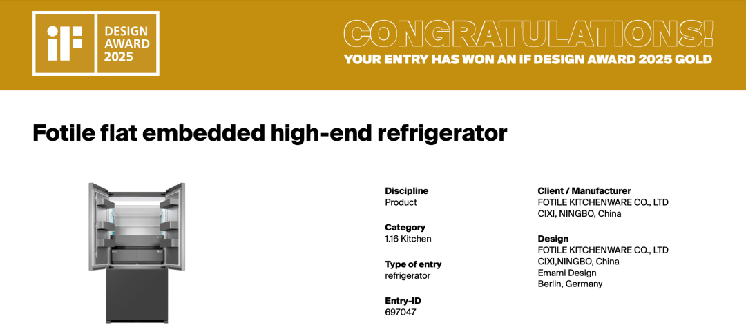 方太全球新一代高端全嵌冰箱设计由国际设计大师Arman Emami操刀,并以0.7%的超低概率斩获2025iF设计金奖,也是唯一摘得该项殊荣的冰箱产品