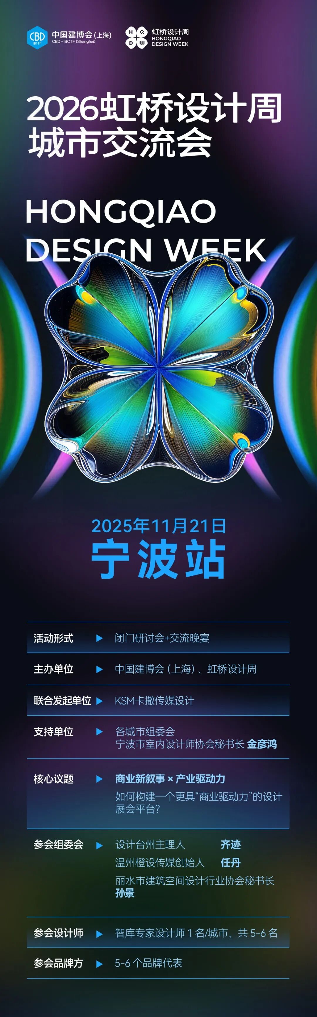 共启五城活动序章凝聚行业智慧,共绘产业未来——“2026虹桥设计周·城市交流会”将于2025年11月正式启幕。本届活动以“链接产业·赋能设计·共筑未来”为主题,以“闭门研讨会+交流晚宴”的深度对话形式,促进产业与设计的实质性交融。活动依次登陆宁波、嘉兴、南京三大城市,并联动华东地区,包括:常州、湖州、嘉兴、丽水、南京、宁波、绍兴、苏州、台州、温州、无锡、扬州、舟山在内的十三个城市,旨在串联起广阔的设计师力量与深厚的产业集群。在深度渗透并有效覆盖华东片区的更构筑起一个辐射全国的未来设计生态,开启一场贯穿设计的思想巡礼。