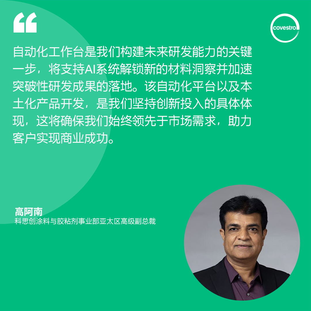 在推出全新涂料解决方案的科思创也着眼于未来研发能力的建设。即将投入运行的Weighing & Mixing Workstation智能工作台,正是公司提升研发效率的一项战略性投资。该系统能在实验过程中处理物料称量与混合工作,将过程数据安全上传至云端。