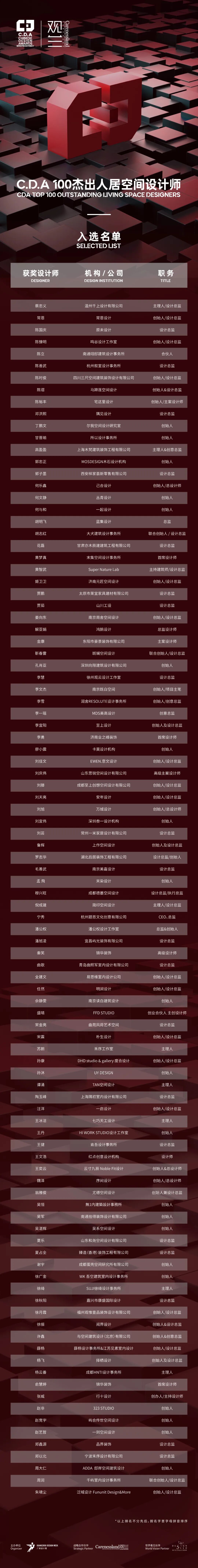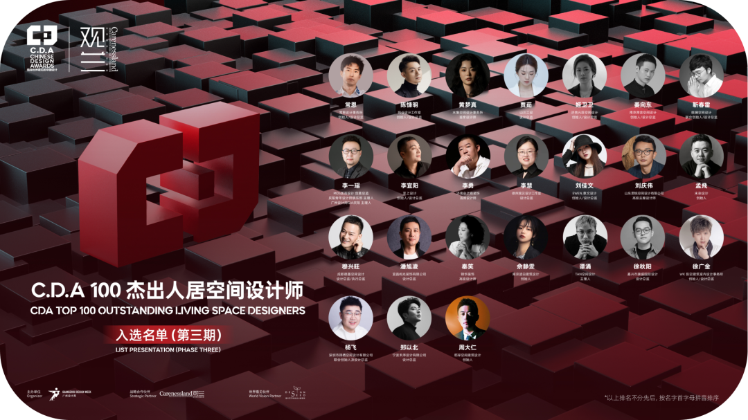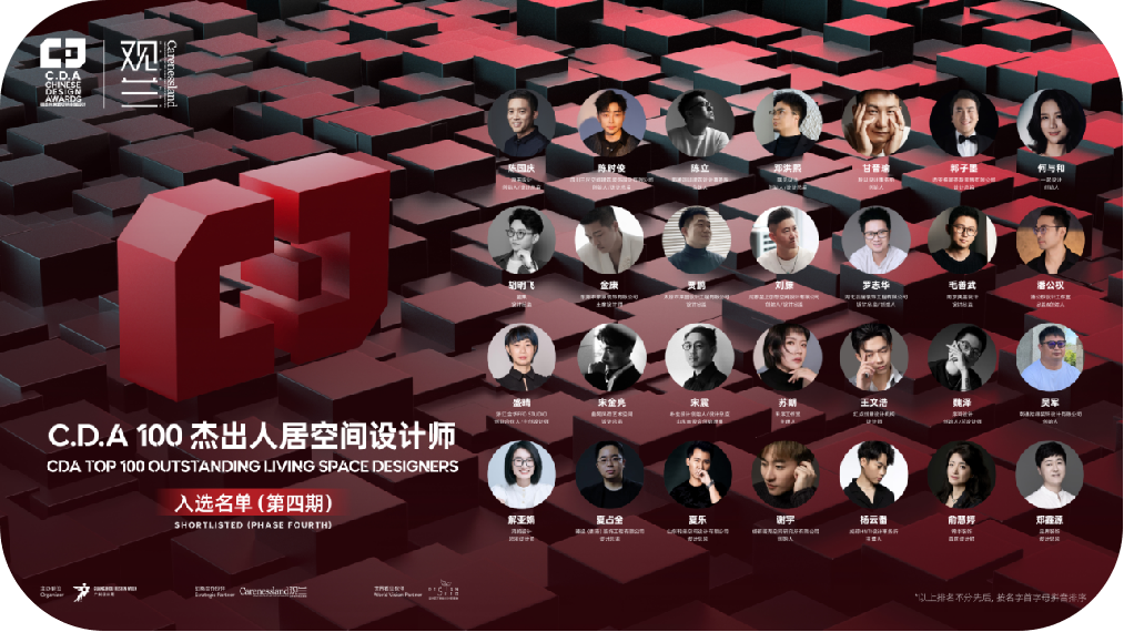 “C.D.A100”是C.D.A值得世界看见的中国设计的新生设计力人物发掘计划,面向全国服务人居空间的杰出设计师进行申报,遵循“最中国、最国际、最当代”的价值主张每年度甄选出不超过100位杰出设计师入选,以此表彰中国设计创意新力量,希冀发掘生生不息、源源不断的值得被世界看见的中国设计新生力量。