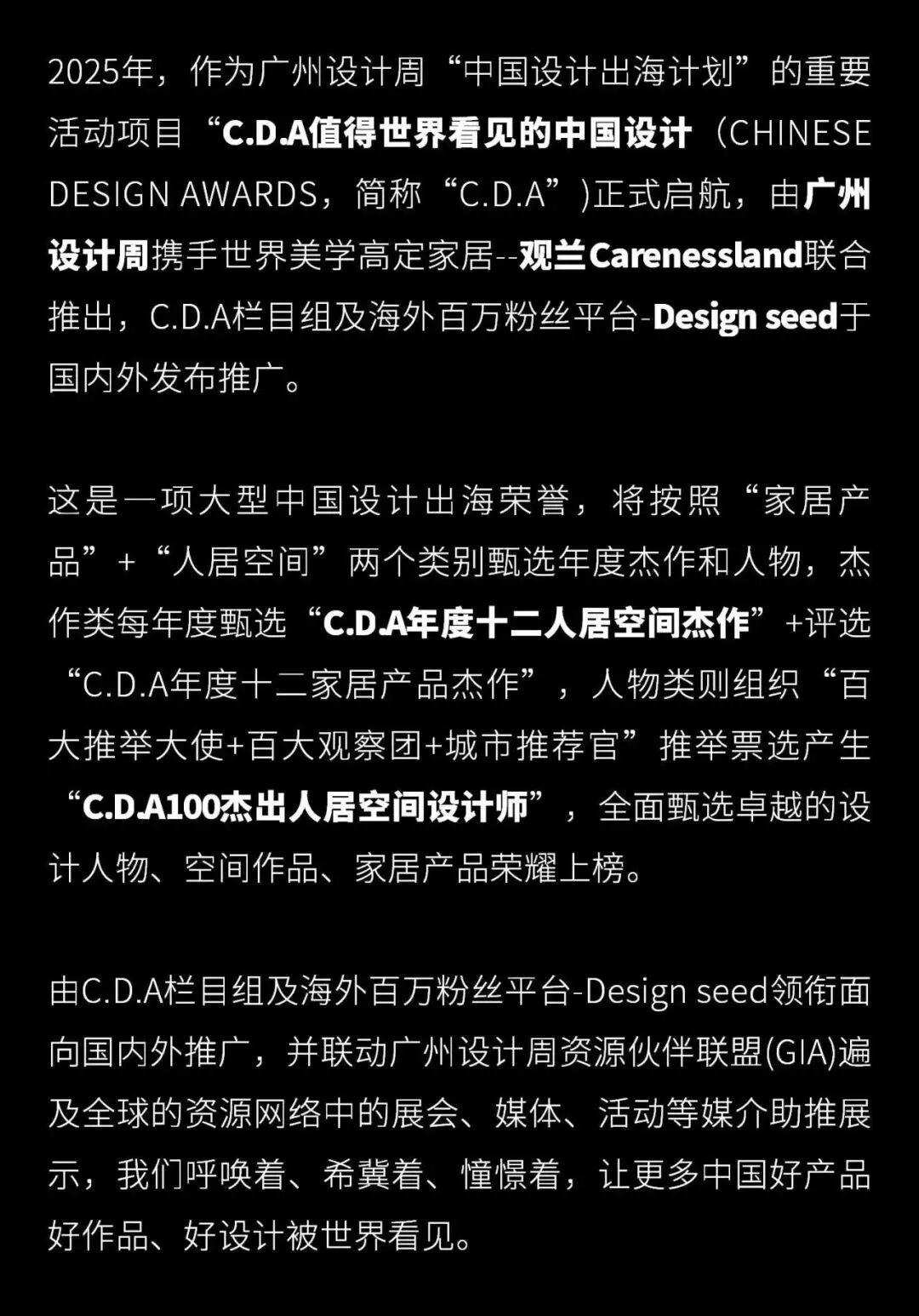 2025年12月5-8日,广州设计周联合观兰CARENESSLAND共启C.D.A值得世界看见的中国设计·2025年度盛典,将通过举办【C.D.A值得世界看见的中国设计·主题策展、C.D.A X 观兰会客厅、C.D.A值得世界看见的中国设计·午餐交流会、C.D.A值得世界看见的中国设计·活动沙龙、观兰之夜·C.D.A值得世界看见的中国设计2025年度荣誉盛典】等系列活动与策展,以展+厅+会+宴的形式展开项目收官盛典,见证中国设计扬帆出海,接轨世界美学,“亲爱”相见!